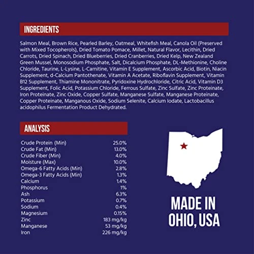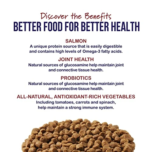 - NUTRIENT-DENSE FORMULATIONS – A holistic blend of salmon full of omeg-3 fatty acids, superfood whole grains, antioxidant-rich fruits and vegetables and probiotics for proper digestion Enriched with taurine
