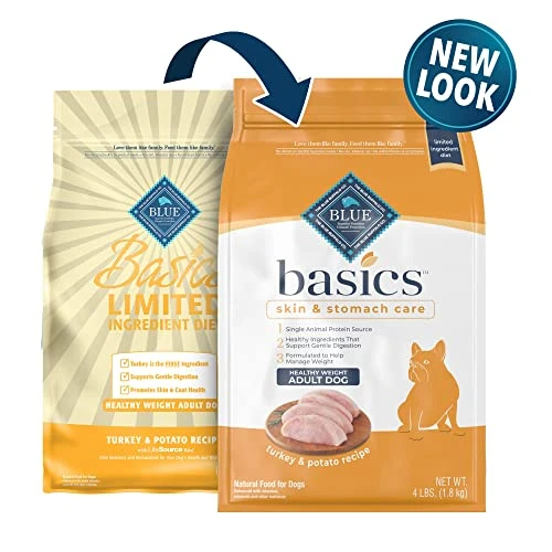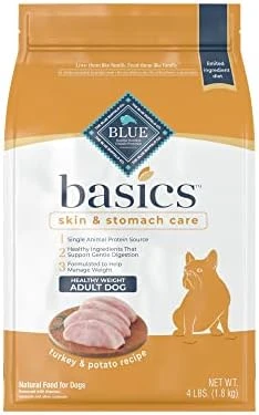 - Contains one (1) 4lb bag of BLUE Basics Skin & Stomach Care, Natural Adult Healthy Weight Dry Dog Food, Turkey & Potato