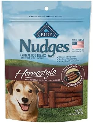 - PACKAGING MAY VARY: Contains one (1) 16oz bag of BLUE Nudges Homestyle Natural Dog Treats, Chicken
