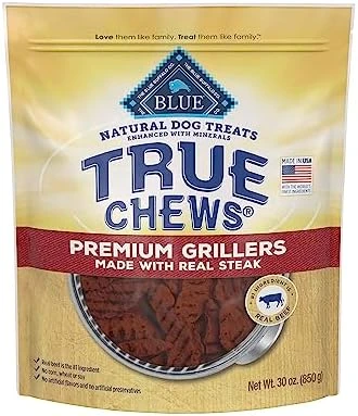 - PACKAGING MAY VARY: Contains one (1) 30 oz bag of BLUE True Chews Premium Grillers Natural Dog Treats, Steak