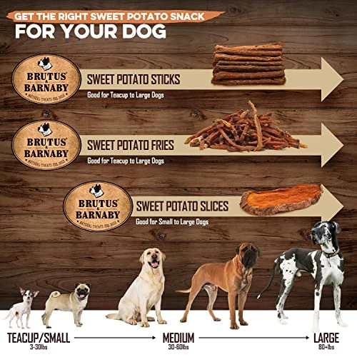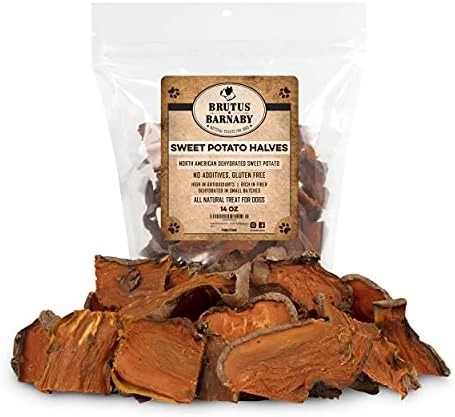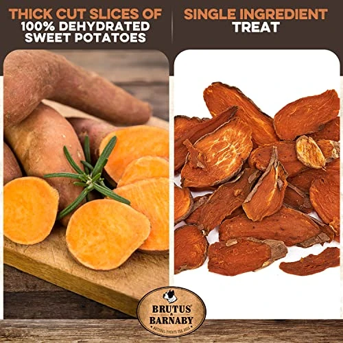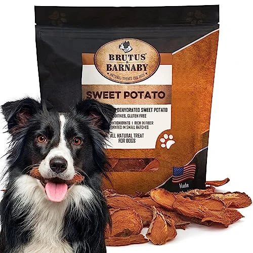 - Our dried sweet potato dog treats are thicker cut for a long lasting chew. Give these vegetarian dog treats often guilt free as there is zero fat, no added sugar, and fiber that helps balance blood sugar levels (great for senior diabetic dogs).