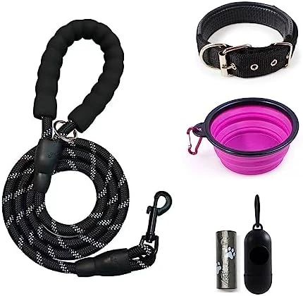 - Dimensions: leash length 59 inches, dog collar adjustable from 14.5 to 18.8, dog food dish diameter 5.1, includes a dispenser with waste bag.