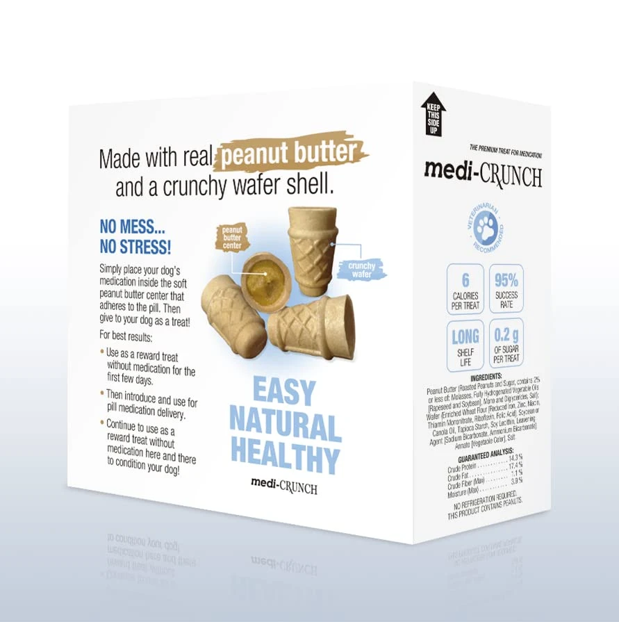 - HIDES SMELL OF MEDS, IRRESISTABLE REAL PEANUT BUTTER. Made with real peanut butter without artificial ingredients, it masks as delicious pill treats for dogs. Dog pill shooter and poppers makes your dog run away…Medi-Crunch makes your dog run to you!