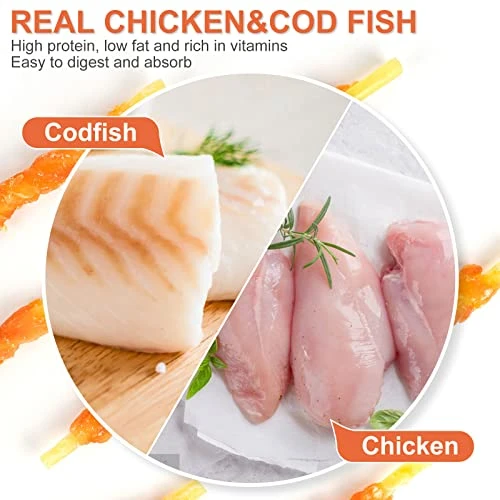 - Natural Ingredients: Real chicken breast wrapped around a cod sticks low in fat and high in protein; Cod sticks also contains Omega 3 and vitamins which promotes shiny coats and skin health among other benefits 100% natural.