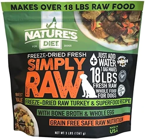 - All Natural Nutrition : At Nature’s Diet, we believe in honest, transparent labels. We are proud of the wholesome, clean ingredients we use to make Simply Raw – unlike some other brands, we never put anything into our dog food that isn’t listed on the label. No fillers, no grains, no GMOs, no unnatural preservatives, no soy, no added flavorings or dyes. Just honest, raw, whole food nutrition. Key Product Features