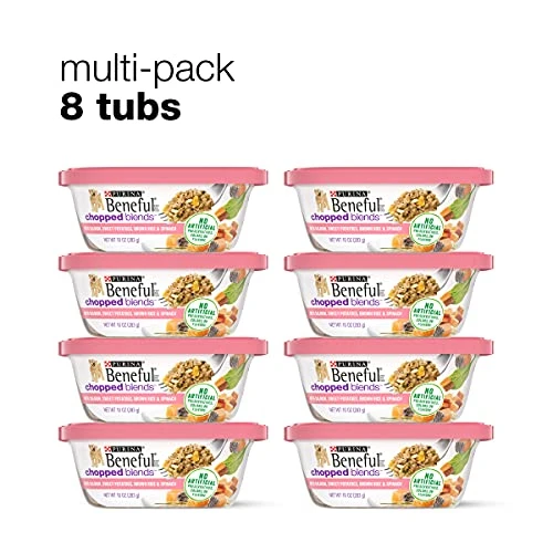 - Beneful Chopped Blends wet dog food made with real salmon and real vegetables and grains you can see