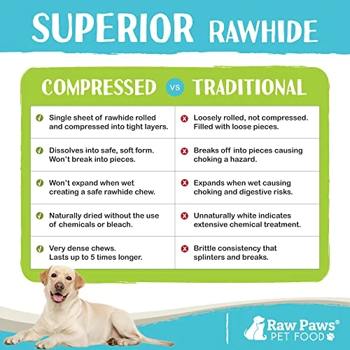 - SAFE RAWHIDES FOR DOGS: A rawhide dog chew stick safe for all dogs! Pressed rawhide dog chews are recommended by vets as a safe rawhide alternative to traditional white, bleached rolled rawhide retriever rolls. Offer as a healthy energy outlet!