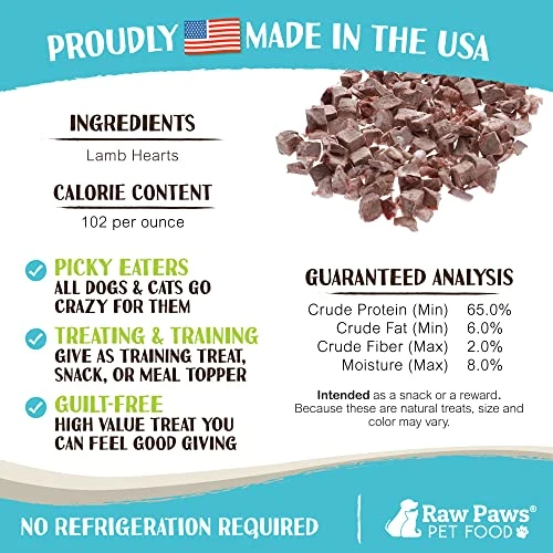 - FREEZE DRIED LAMB DOG TRAINING TREATS MADE IN USA: Raw Paws only partners with responsible and ethical American sources to produce these lamb heart treats! Treat, train and spoil your pets with our soft lamb treats for puppies, dogs, cats and ferrets.