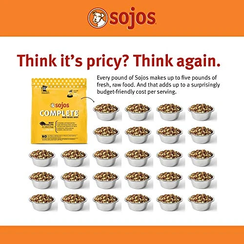 - Safe and Economical: Every pound of Sojos makes up to 5 pounds of fresh, raw food for a surprisingly budget friendly cost per serving; our gentle, proprietary freeze drying process makes raw meat safe without heat or chemicals