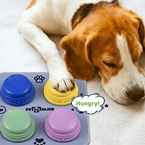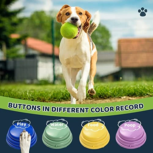 - 【4pcs Voice Recording Buttons for Pet Training】You can record commands like sit, play, water, food, go out and so on by these 4pcs voice recording buttons. Different colors design makes it easier for dogs/cats to understand the commands, so as to achieve better training effect. When your pet learned the commands, he can press the talking buttons to express his thoughts to you.