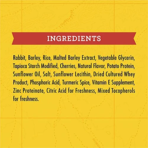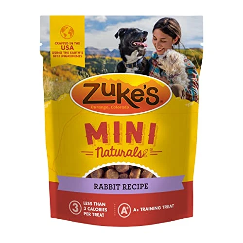 - Healthy dog treats made with natural ingredients like real rabbit and whole food berries
